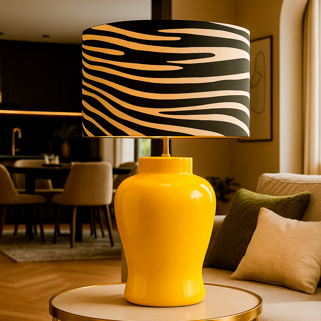 Todas nuestras lámparas son piezas únicas, diseñadas y fabricadas por encargo. Las bases, realizadas por Paz Vial, están elaboradas en cerámica y pintadas a mano. Cada pantalla está confeccionada artesanalmente en algodón, con interior dorado o blanco según el modelo.