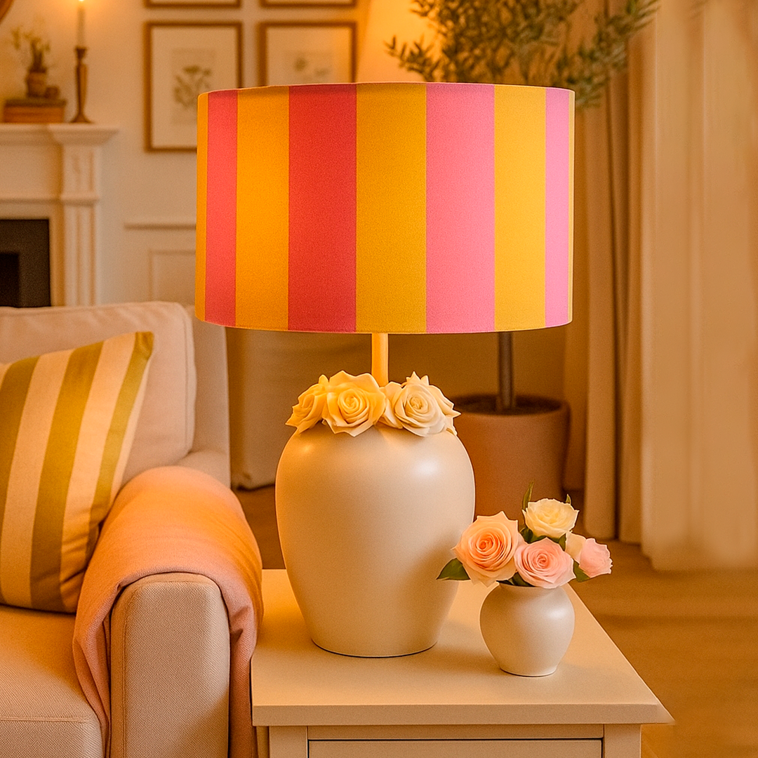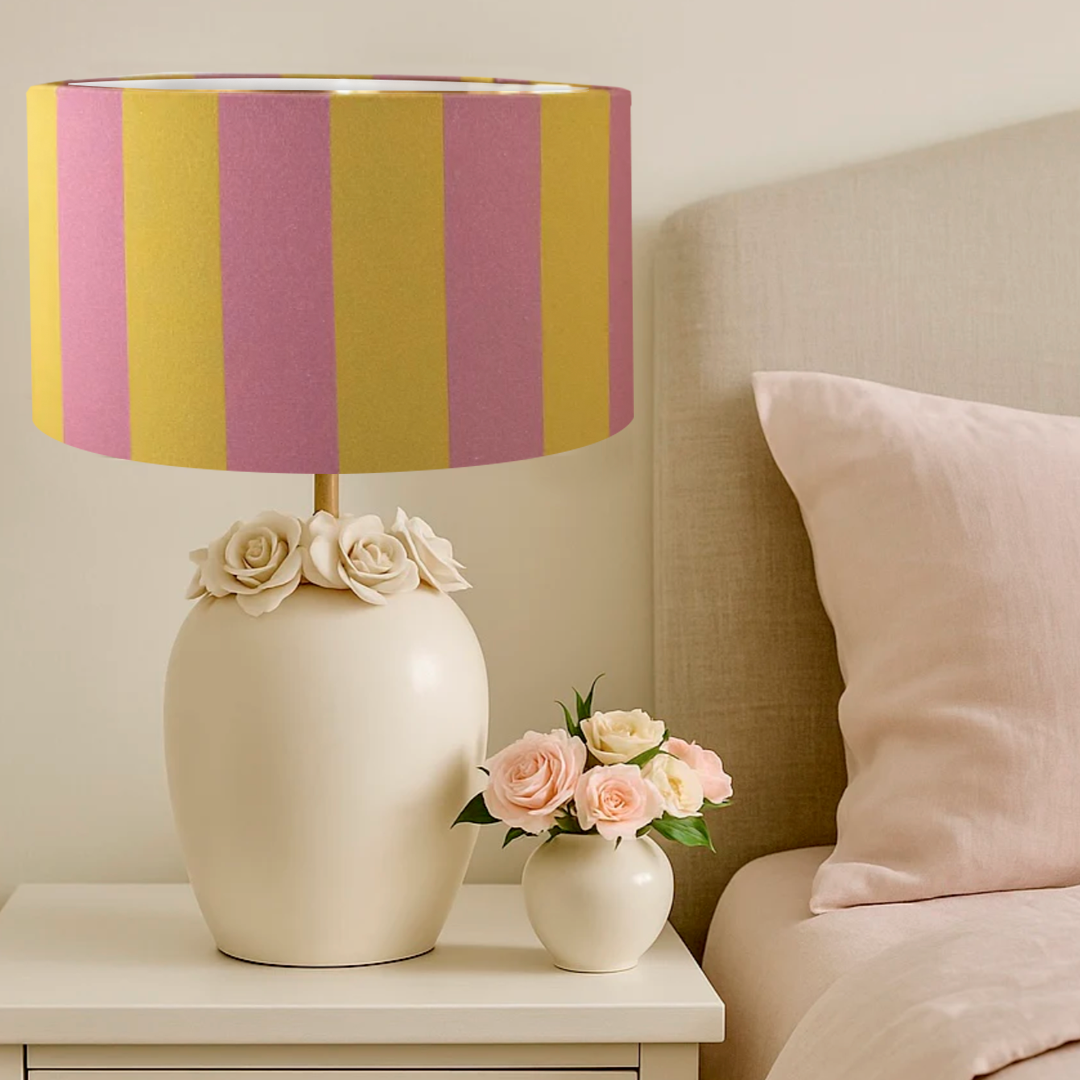 Todas nuestras lámparas son piezas únicas, diseñadas y fabricadas por encargo. Las bases, realizadas por Paz Vial, están elaboradas en cerámica y pintadas a mano. Cada pantalla está confeccionada artesanalmente en algodón, con interior dorado o blanco según el modelo.